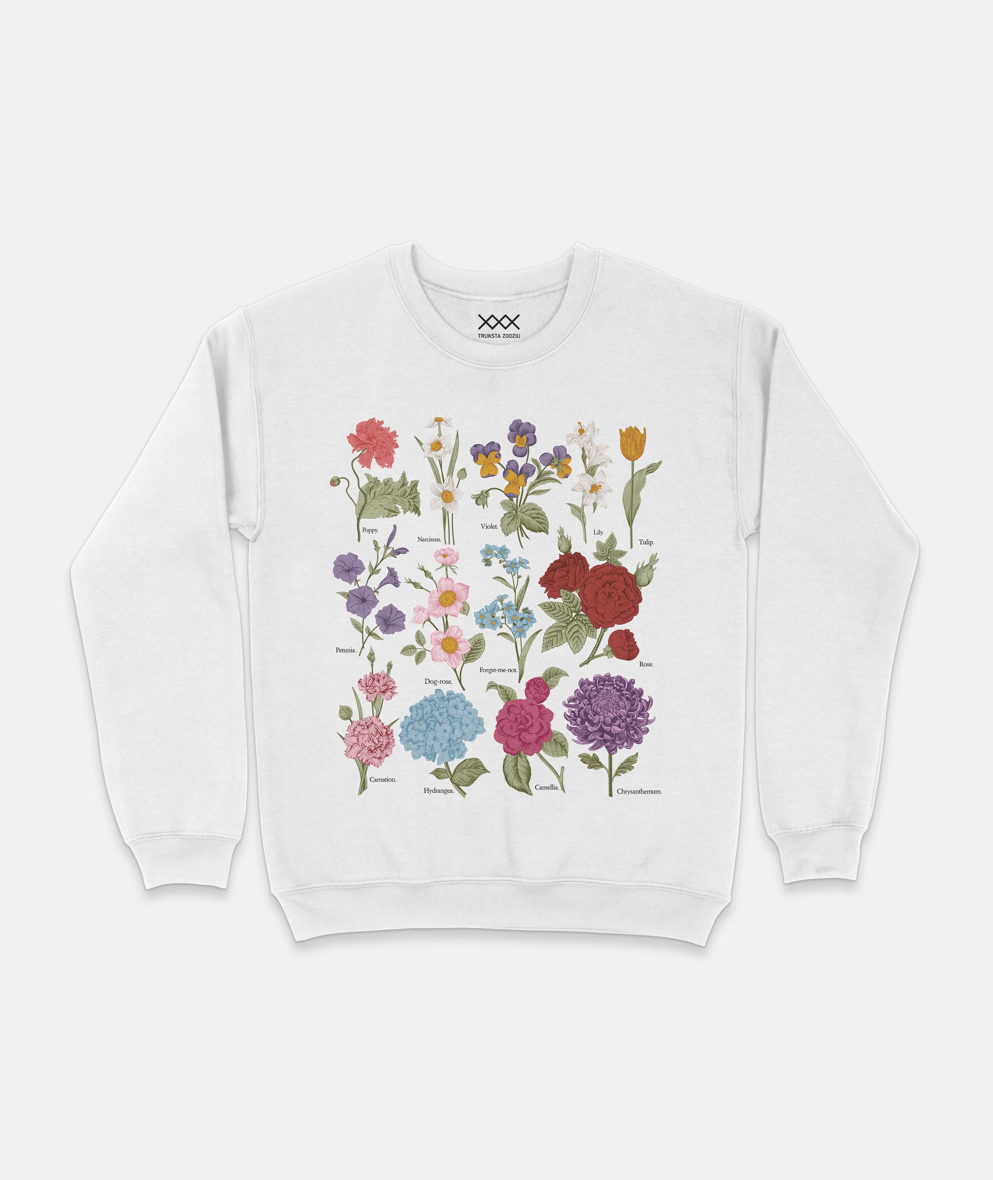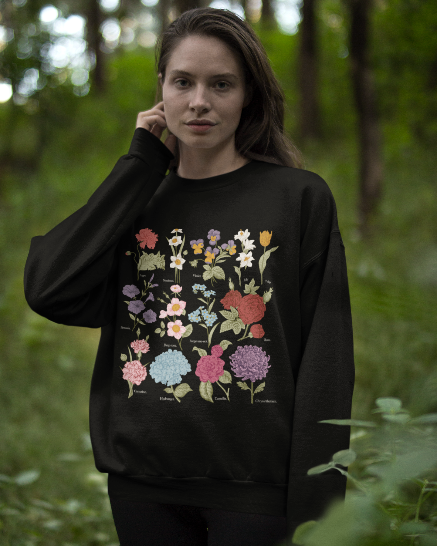 Vintažinio stiliaus džemperis su botaninių iliustracijų spauda – dizainas, įkvėptas vintažinio meno ir gamtos pažinimo. Stilingi laisvalaikio džemperiai su subtiliais, meniškais akcentais tampa išskirtiniu aprangos elementu. Estetiškas džemperio modelis ir autentiškas piešinio išpildymas sukuria harmoningą ryšį tarp gamtos estetikos ir šiuolaikinės miesto mados.