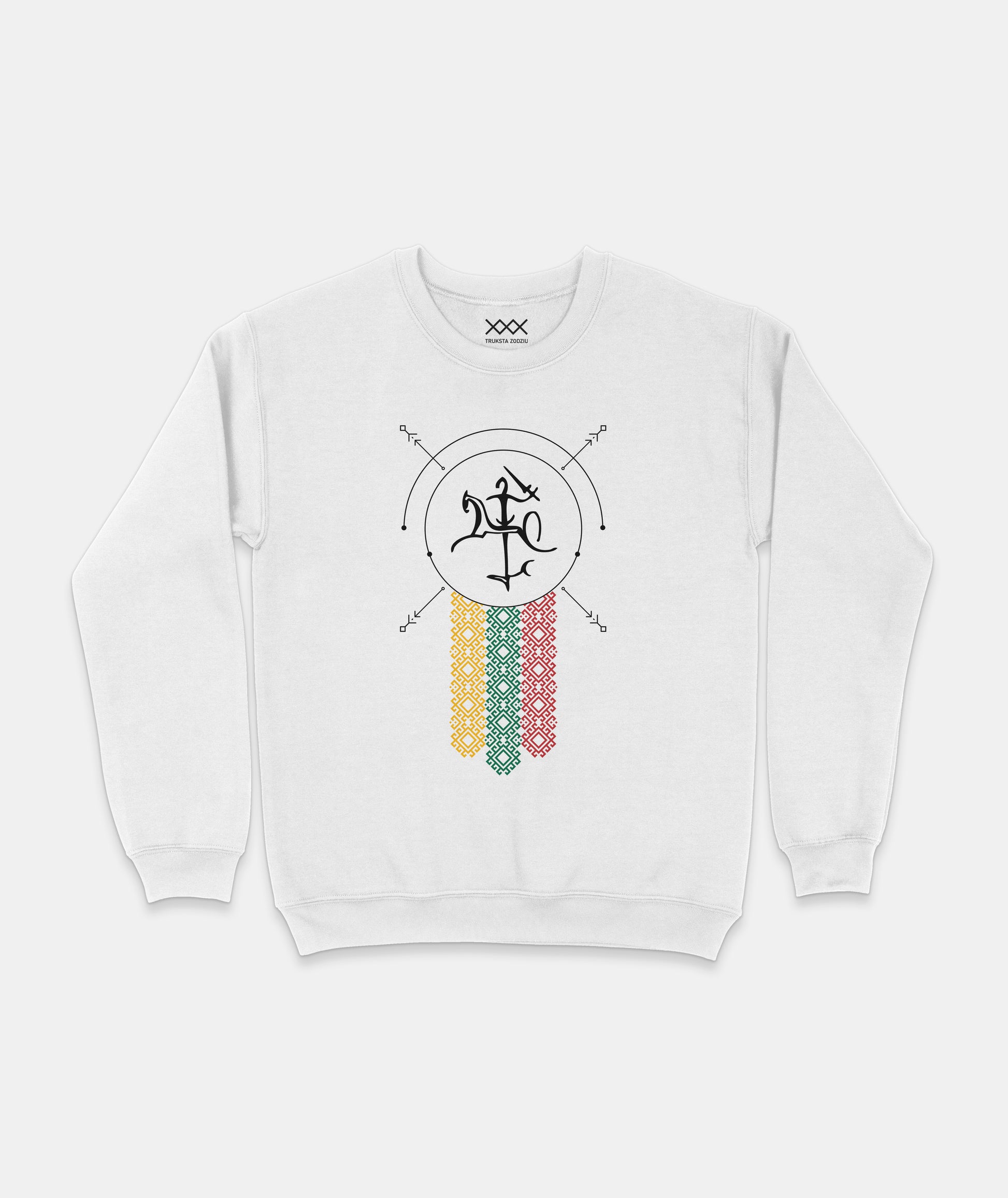 Autentiškas lietuviškos atributikos džemperis su moderniai interpretuotu Vyčio simboliu ir tautinės juostos raštais – istorinės prasmės ir dizaino harmonija. Trys stilizuotos juostos trispalvės spalvomis perteikia tautinį identitetą per folkloro raštus, o simbolinis Vyčio ženklas suteikia džemperiui istorinės vertės. Tai nuostabus pasirinkimas besididžiuojantiems savo šaknimis ir vertinantiems kokybišką, stilingą aprangą.