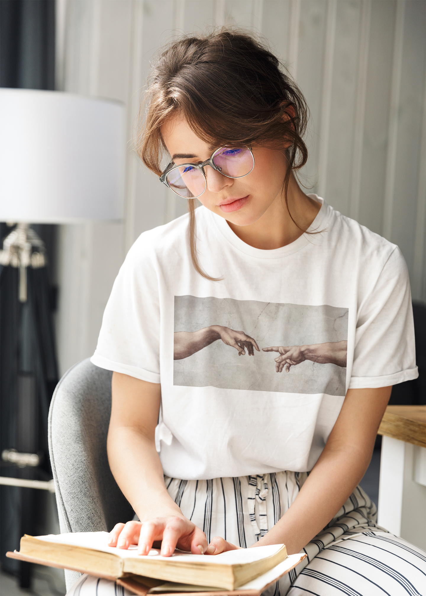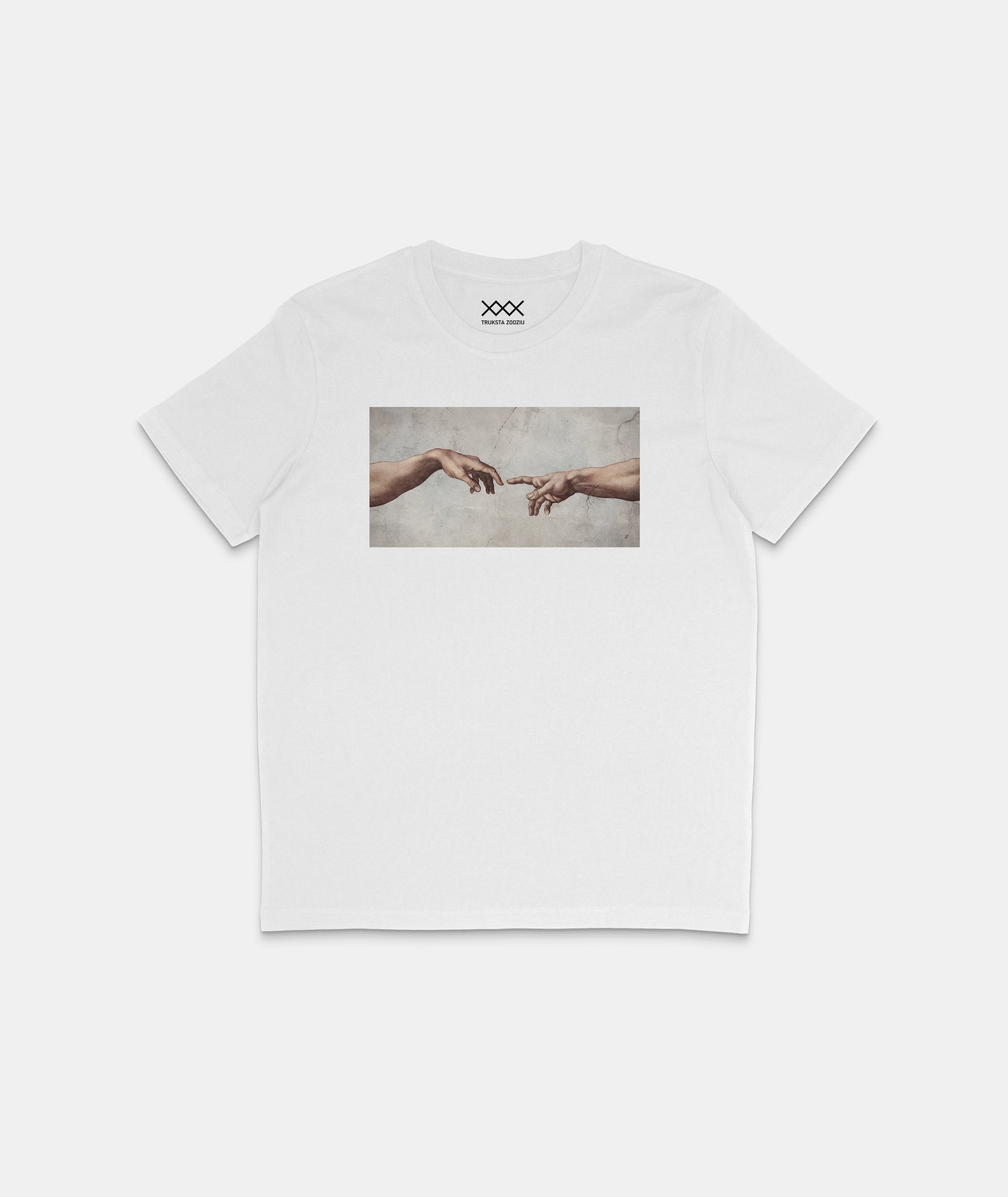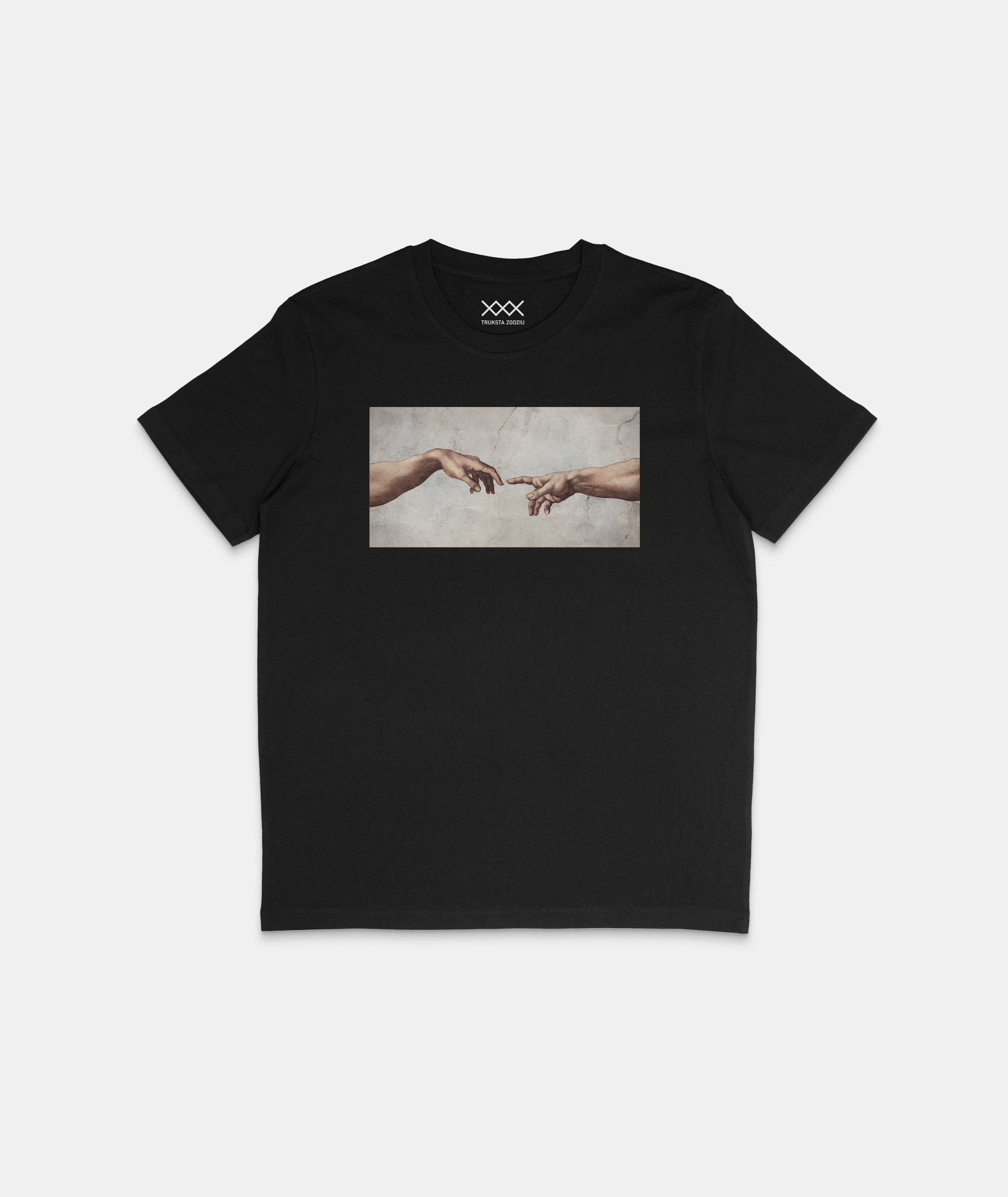 Marškinėliai su meno kūriniu „Adomo sukūrimas“ – patogūs ir kokybiški, sujungiantys klasikinio meno ir šiuolaikinio stiliaus harmoniją. Šie stilingi marškinėliai su spauda puikiai papildo tiek kasdienį, tiek menišką įvaizdį.