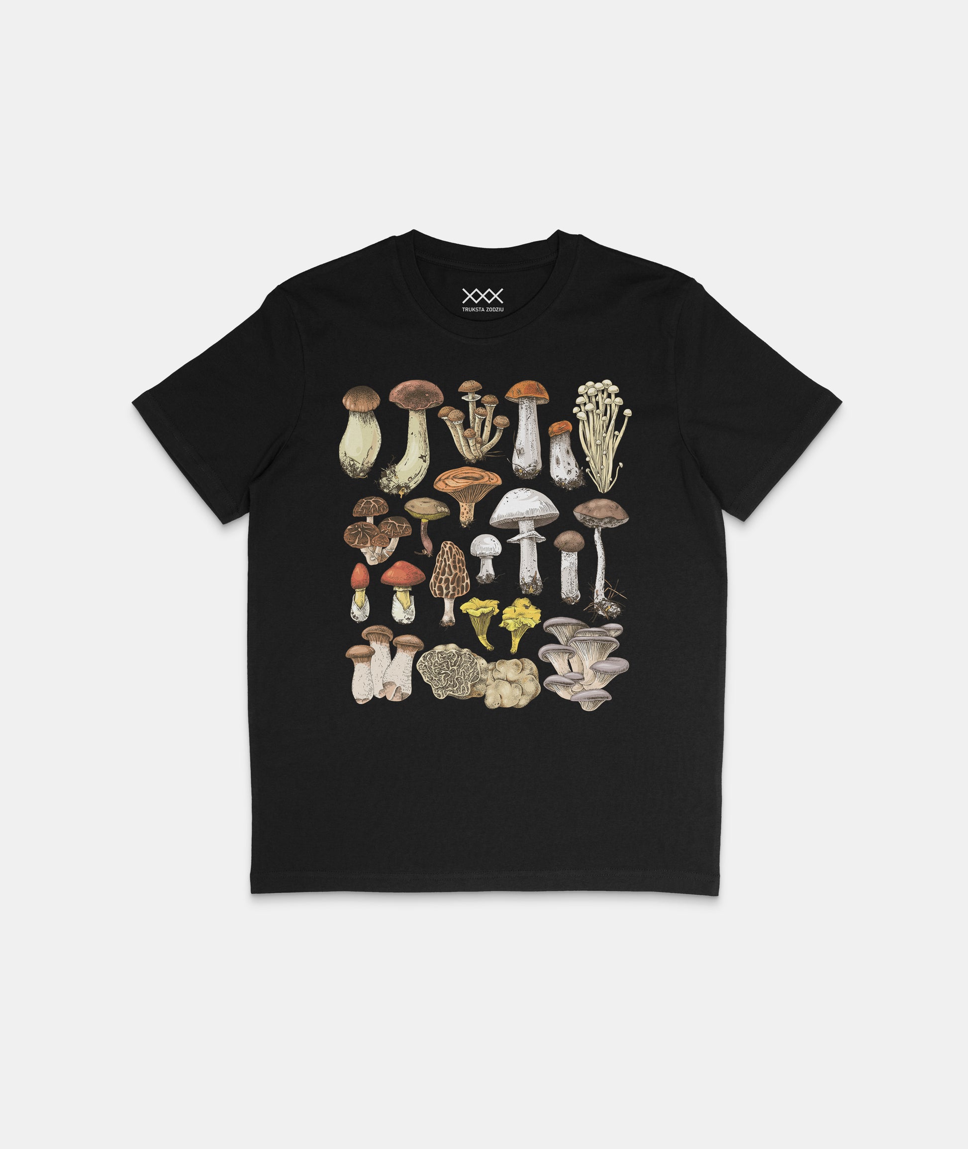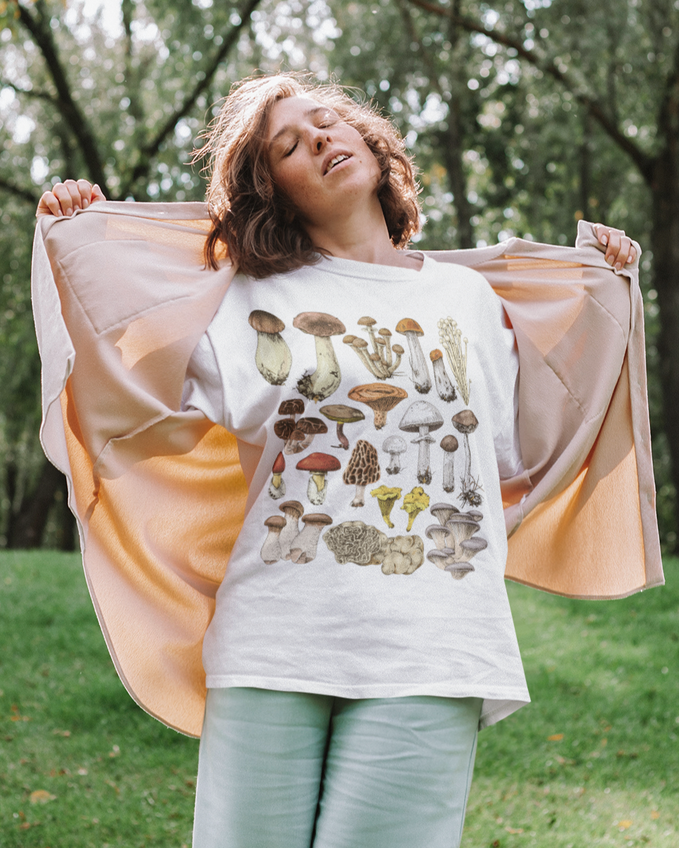 Gamtos įkvėpti vintažinio stiliaus marškinėliai su grybų iliustracijomis – subtili ir unikali botaninės estetikos išraiška. Šis dizainas puikiai tinka grybautojams, gamtos mylėtojams ir vintažinio stiliaus gerbėjams. Marškinėliai su meno kūriniais tampa vis populiaresni tarp tų, kurie vertina autentiškus ir gamtos motyvais paremtus dizainus.