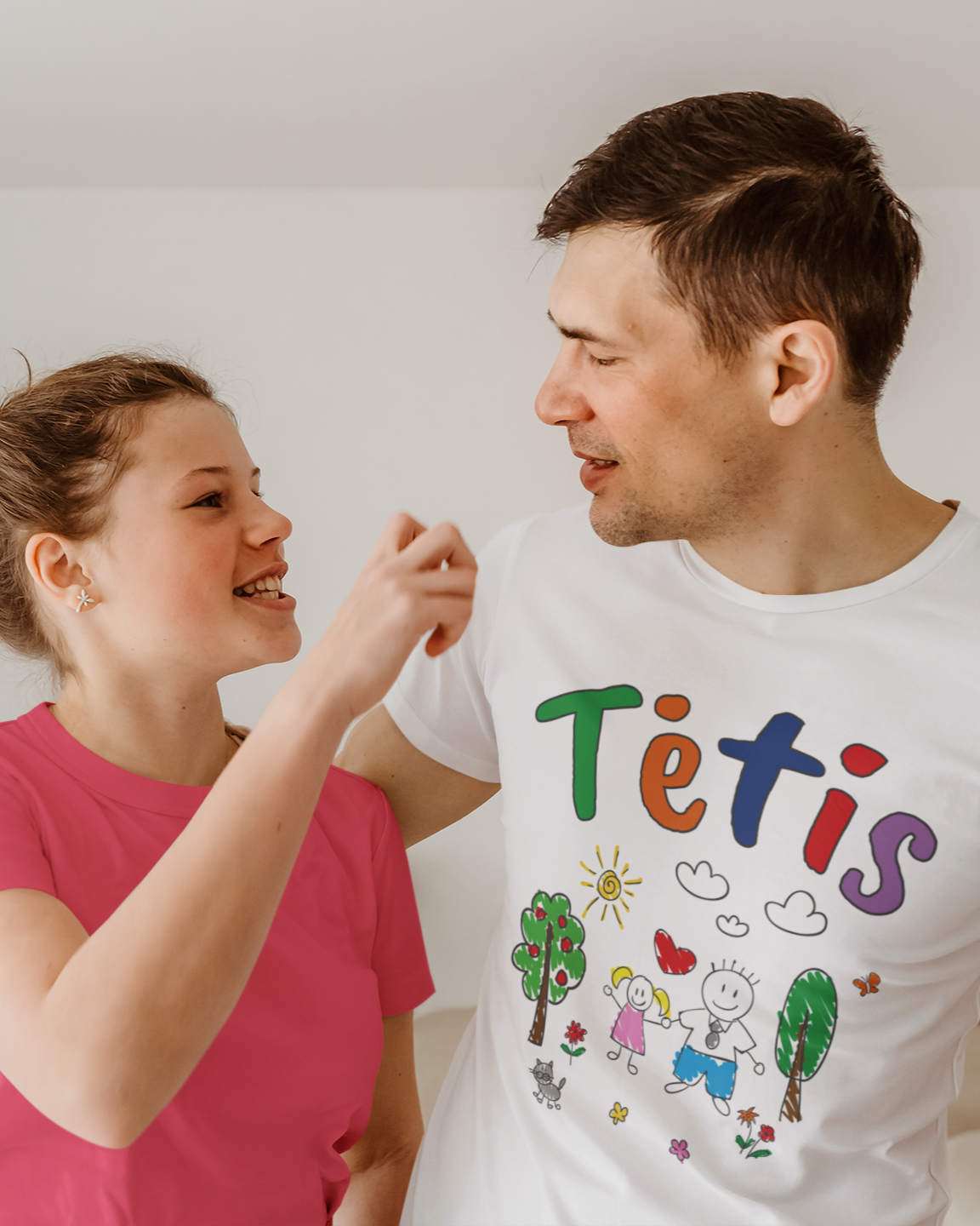 Žaismingi marškinėliai „Tėtis“ su vaiko stiliumi pieštu piešiniu – tai originali dovana tėčiui, kuri primena pačias gražiausias vaikystės akimirkas. Personalizuotų marškinėlių stiliaus įkvėpti marškinėliai ne tik patogūs, bet ir sukurti kaip vertinga ir prasminga dovana. Spalvotas vaikiška ranka pieštas dizainas praturtina drabužį meile, nuoširdumu ir artumu tarp tėčio ir vaiko. Puikus pasirinkimas Tėvo dienai ar bet kokiai progai, kai norisi pradžiuginti tėtį!