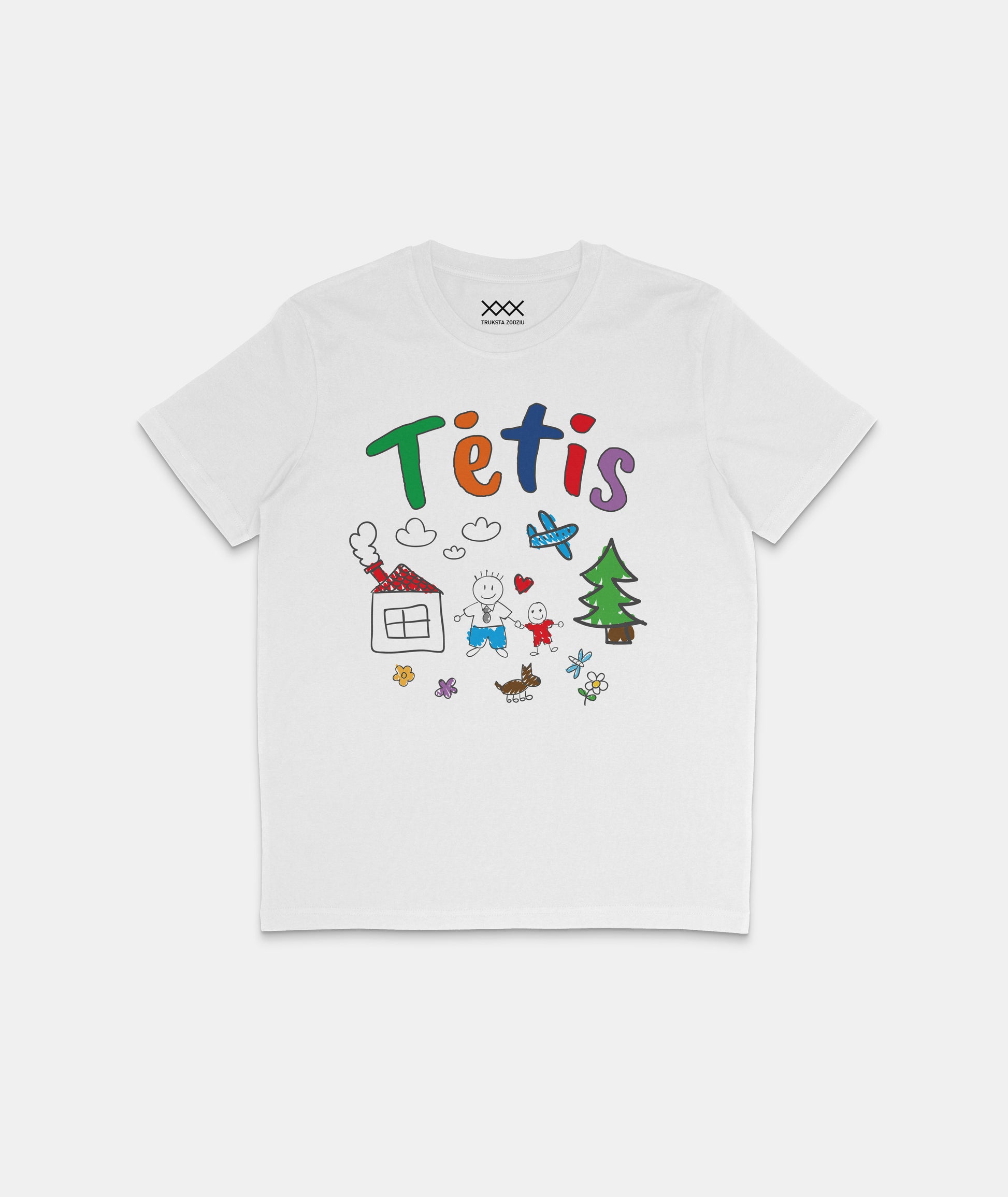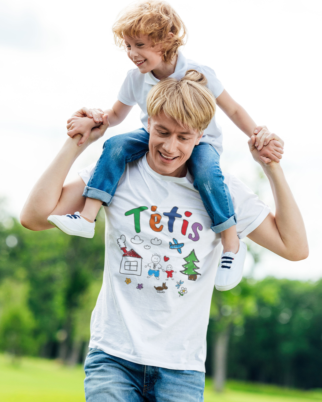 Spalvingi marškinėliai Tėčiui su žaismingu dizainu, primenančiu vaikišką piešinį – „Tėtis“ su sūnumi pievoje, apsupti gamtos elementų. Šis vaikiško piešimo stiliaus dizainas perteikia šilumą, meilę ir nepamainomą vaikystės pasaulį, kuriame tėtis – tikras herojus. Minkšti, patogūs ir ilgaamžiai marškinėliai sukurti taip, kad taptų mėgstamiausiu Tėčio drabužiu.
