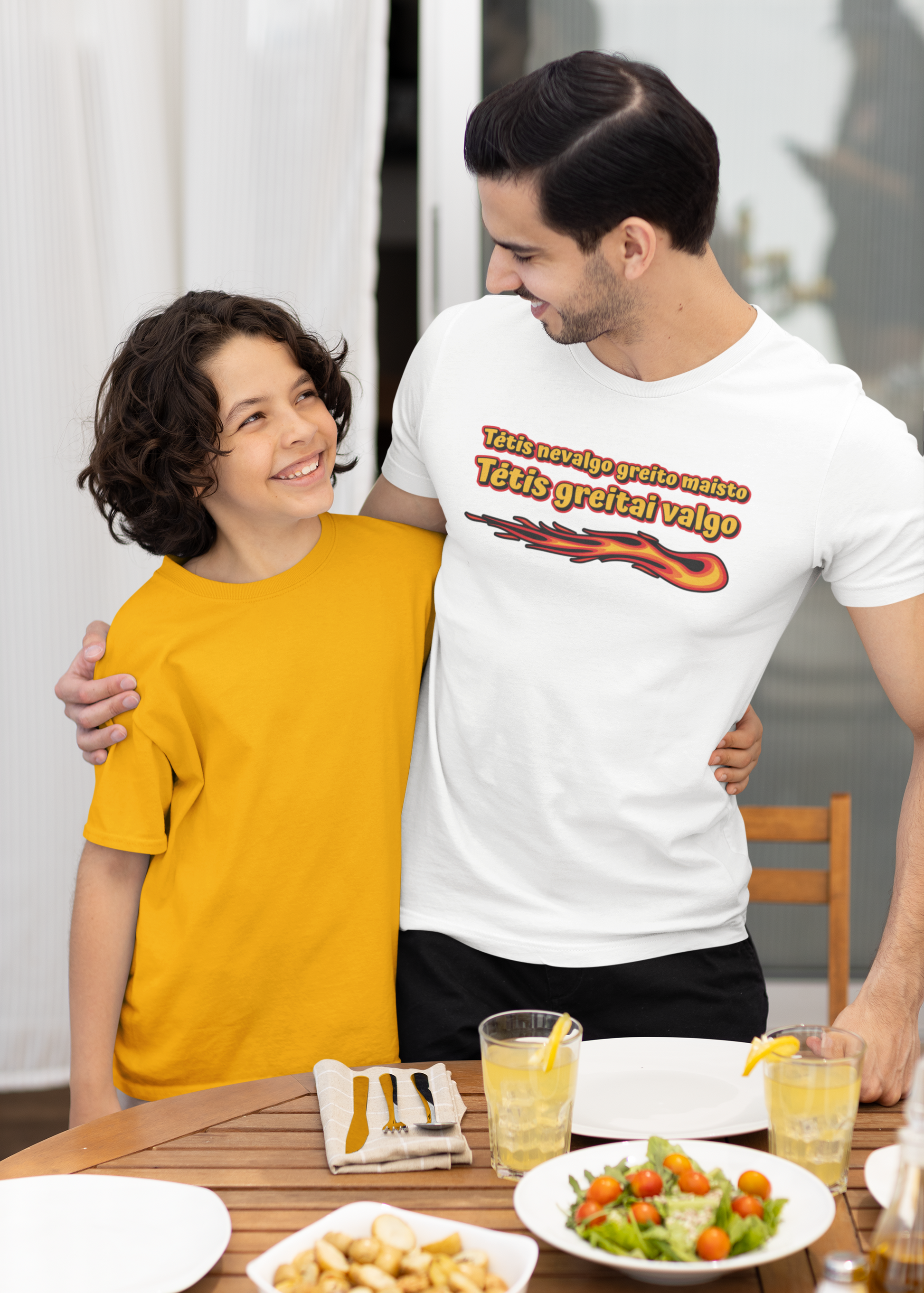 Juokingi ir stilingi marškinėliai Tėvo dienai su išskirtiniu užrašu: „Tėtis nevalgo greito maisto – tėtis greitai valgo“. Tai šmaikštus marškinėlių dizainas, sukurtas tėčiams, kurie mėgsta gerą humorą ir visada pavalgo pirmi. Lietuviški marškinėliai su užrašu taps puikia dovana nuotaikingam tėčiui, o vėliau ir kasdieniam dėvėjimui. Spausdinti ant kokybiškos medvilnės, šie marškinėliai su spauda yra ir išskirtiniai ir ilgaamžiai.